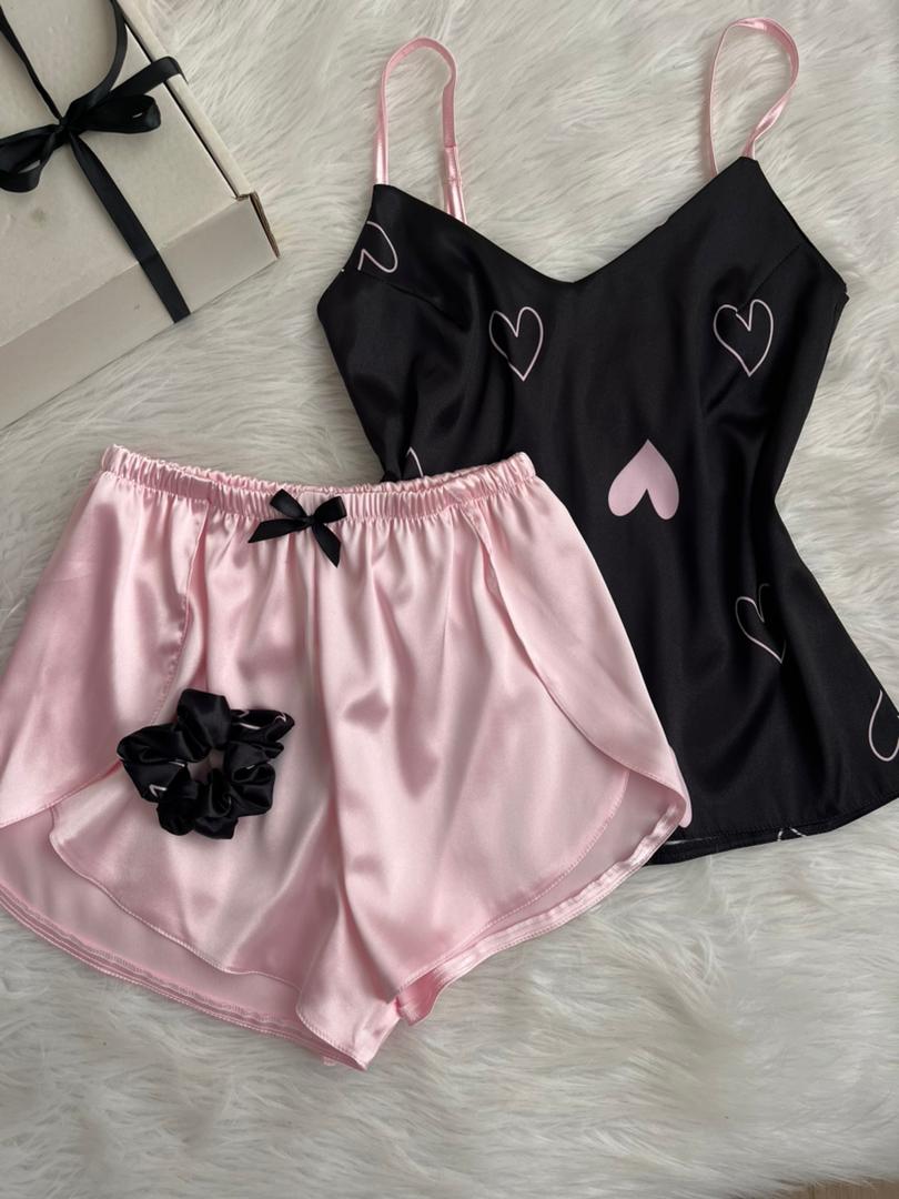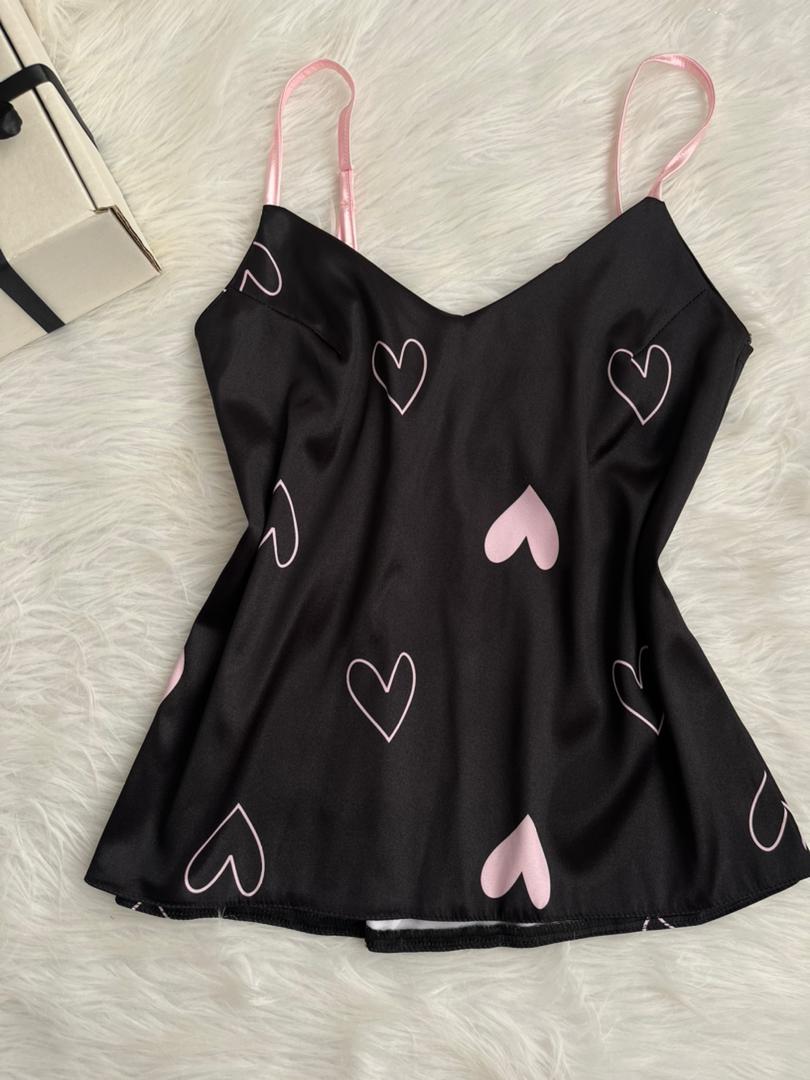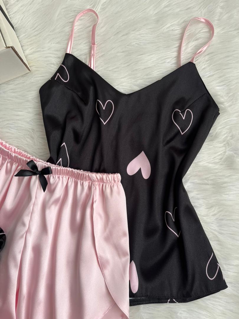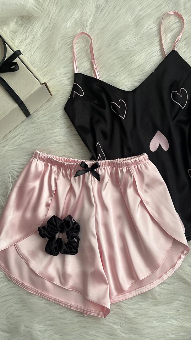 تاپ مشکی قلبی توپر توخالی و شورتک صورتی لاله